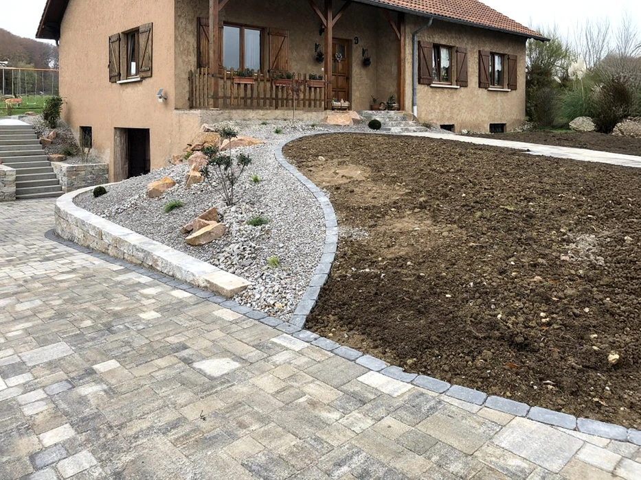 Nous préparons votre terrain avec soin en créant une structure multicouche (décaissement, géotextile, fondation en grave compactée, couche de réglage et lit de pose) qui assurera la stabilité, le drainage efficace et la durée de vie de votre aménagement.